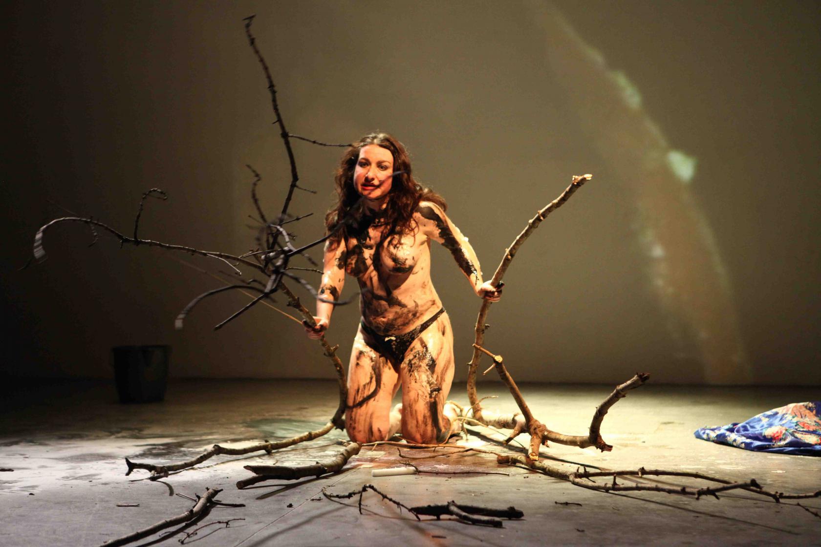 Telle une Mouchette contemporaine, je crée toutes les renaissances ou mises à mort de moi-même, me transformant sans cesse grâce à des matières naturelles : je deviens tantôt femme lion, ou femme incrustée de poissons, ou encore collée à un arbre une nuit durant en pleine forêt, comme faisant corps avec celui-ci, mais une autre fois je raconte comment je m’attache des jours entiers à une vache.